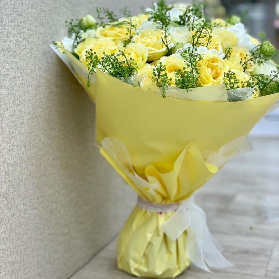 Прекрасный букет цветов! Немного опала 1 роза, но это не заметно. Пышные, красивые розочки. Я была в восторге от такого подарка.