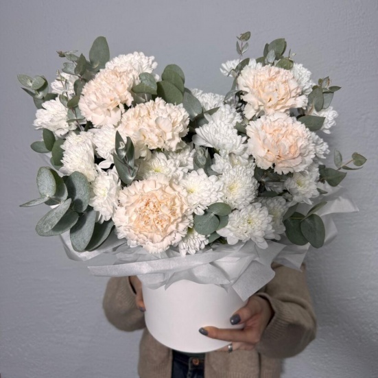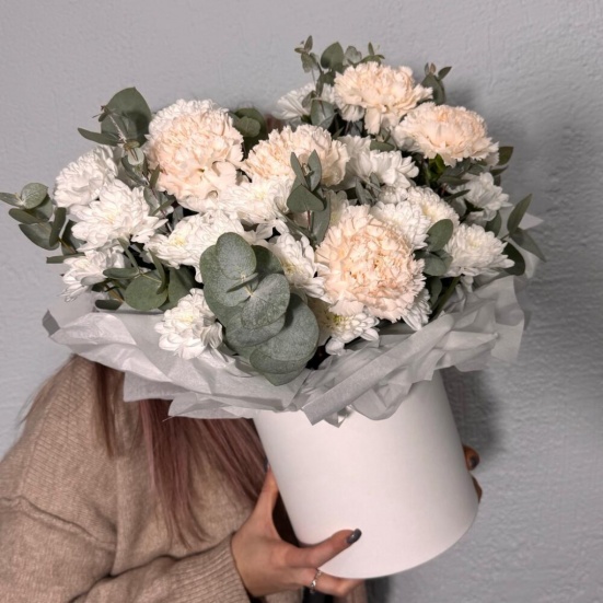 Коробка из кустовых хризантем и диантуса